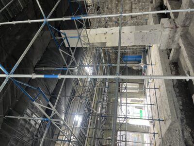 改修工事における足場組立は、「建物を守りながら、安全かつ効率的に作業する」ことが何よりも重要です。本日は、現在進行中の改修足場組立の途中段階について、現場の様子を交えながらご紹介します。